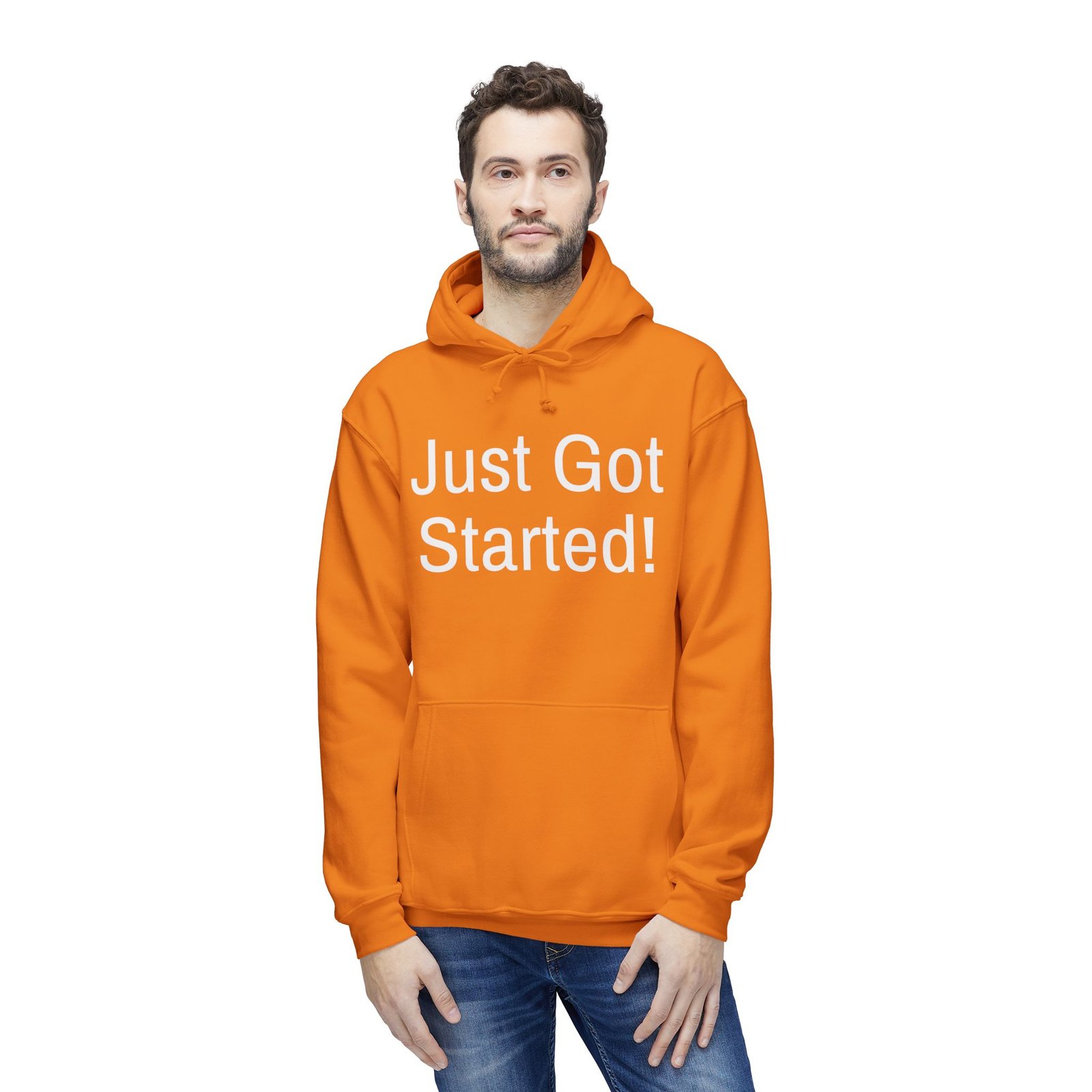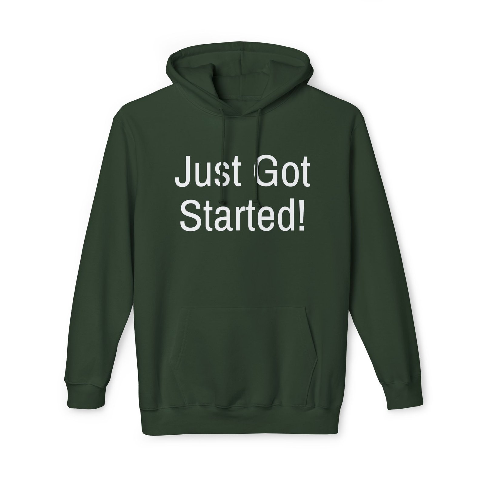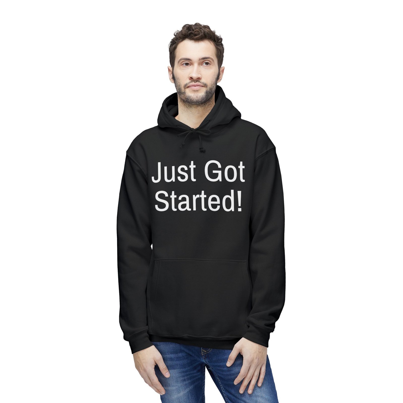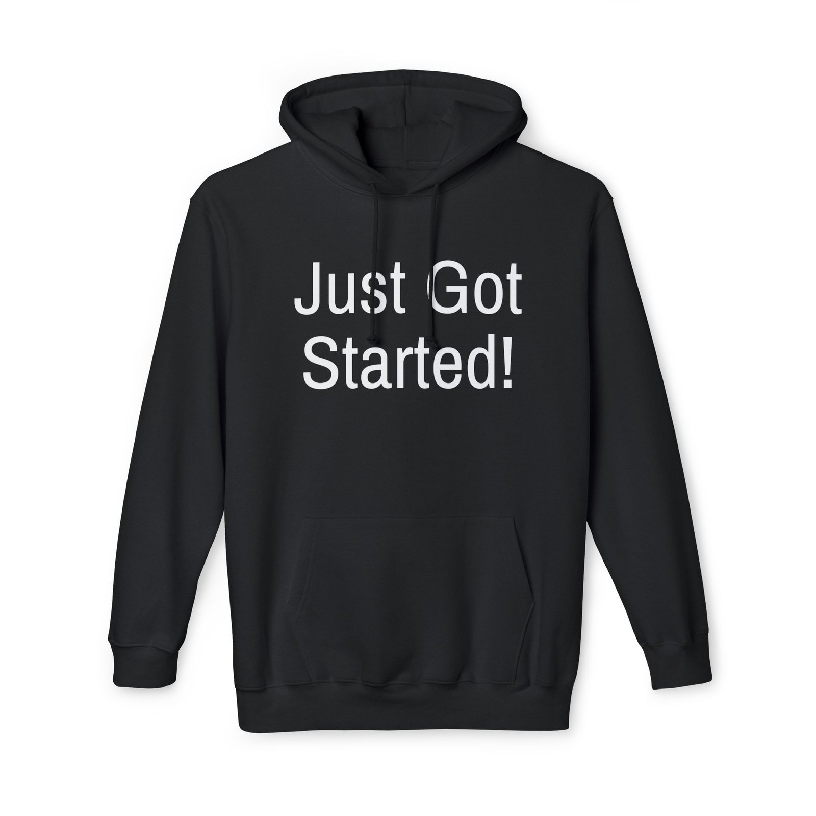This hoodie carries quiet confidence. The bold, straightforward “Just Got Started!” print sits on a heavyweight, soft black sweatshirt that feels like a nudge — the kind you give yourself before a first run, a new project, or a bold life change. Slip it on and you get the warm weight of a well-made garment: a double-lined hood with drawstring, ribbed cuffs and hem that keep shape, and a roomy front pouch for cold hands or a phone. It’s sewn and assembled in the USA, with fabric that prints cleanly and holds its look over time. Wear it to morning meetups, late-night hustle sessions, or when you want your confidence to do the talking.